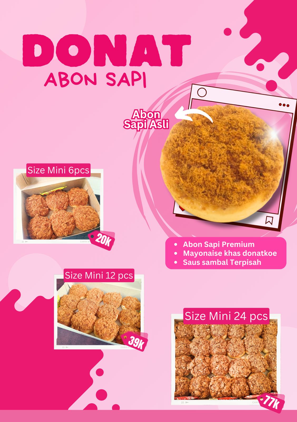 Donat lembut dengan taburan Abon Sapi kualitas Super terbaik, Khas bangeet. Beda dengan yang lain!